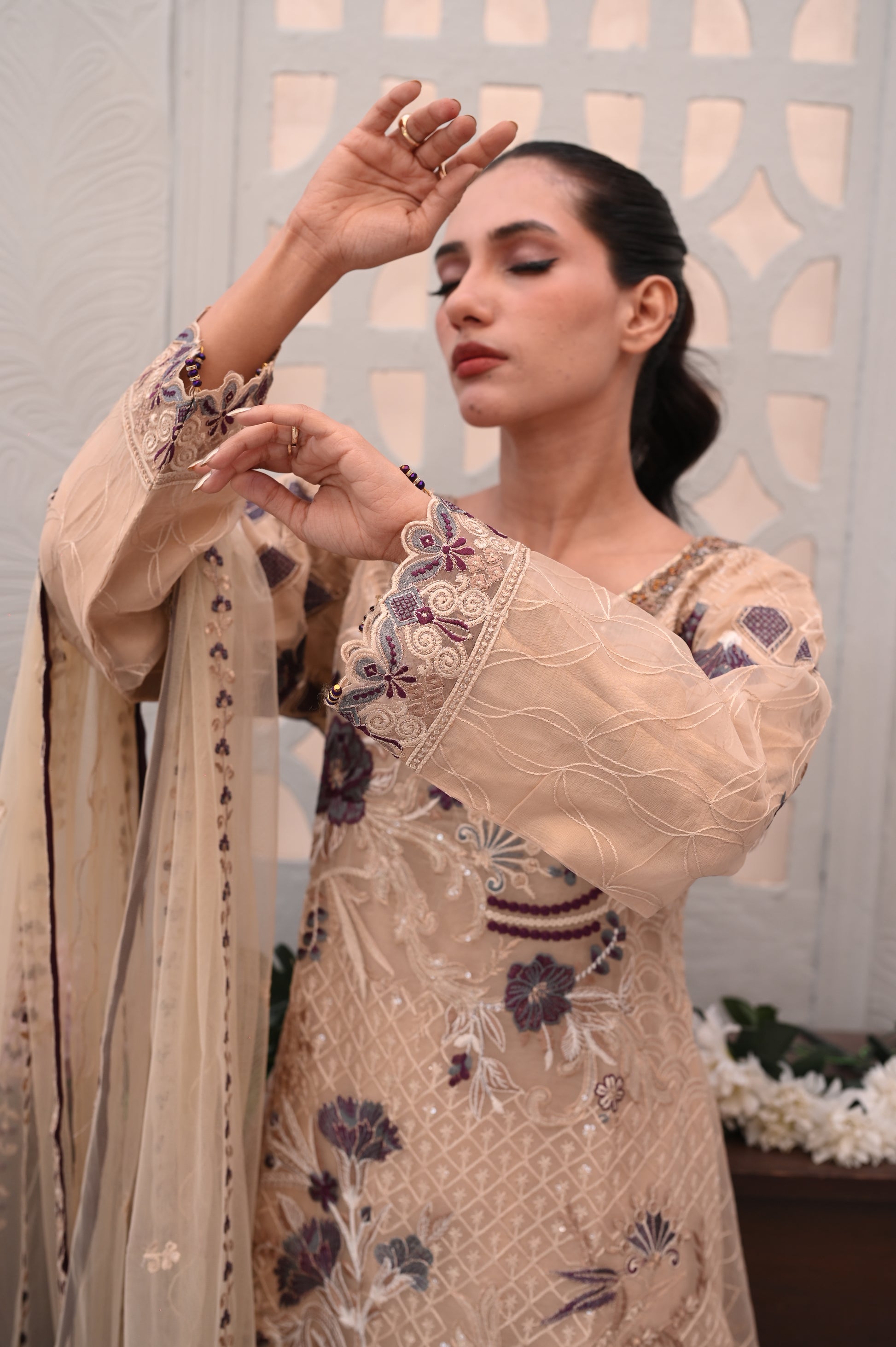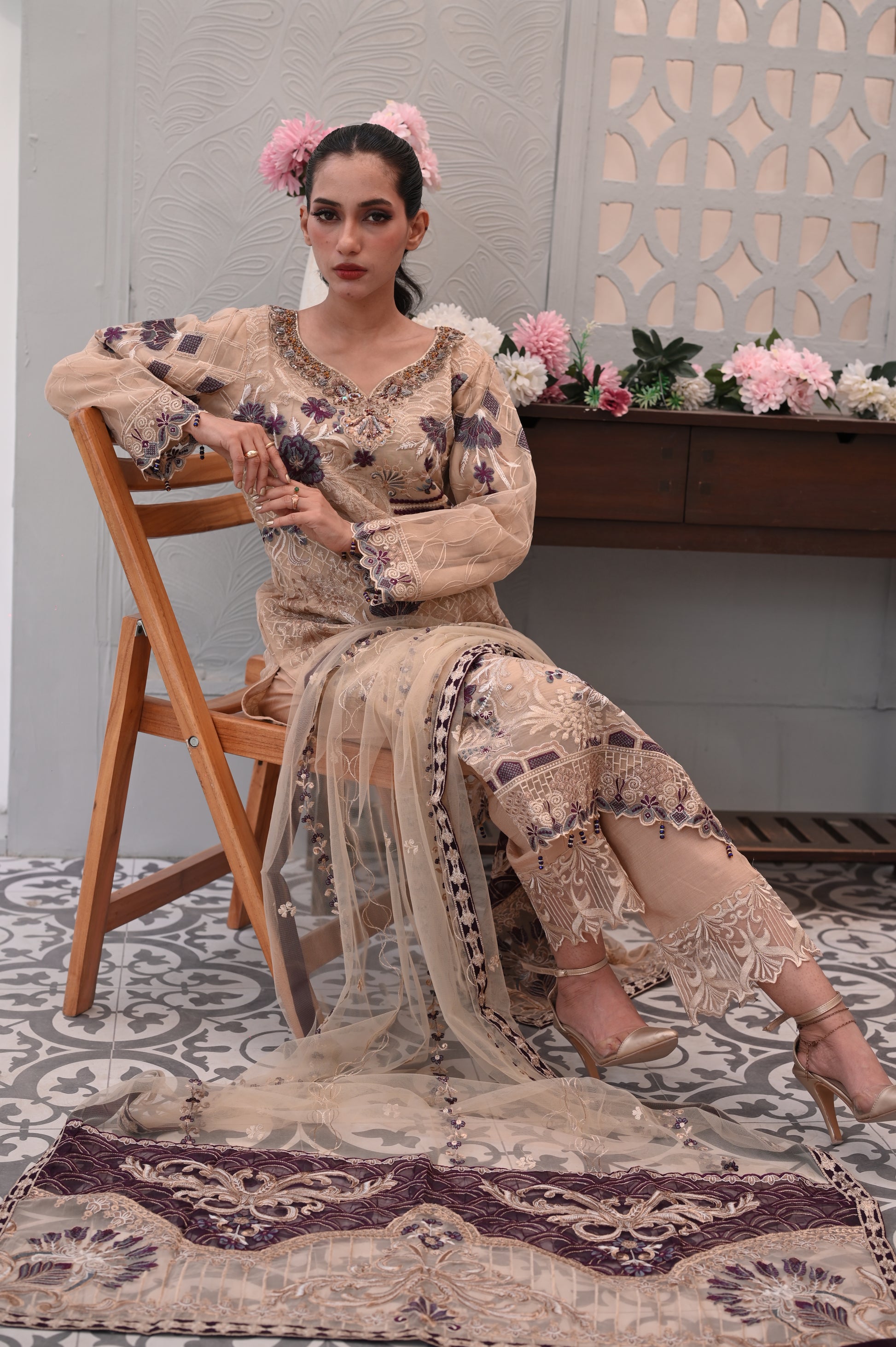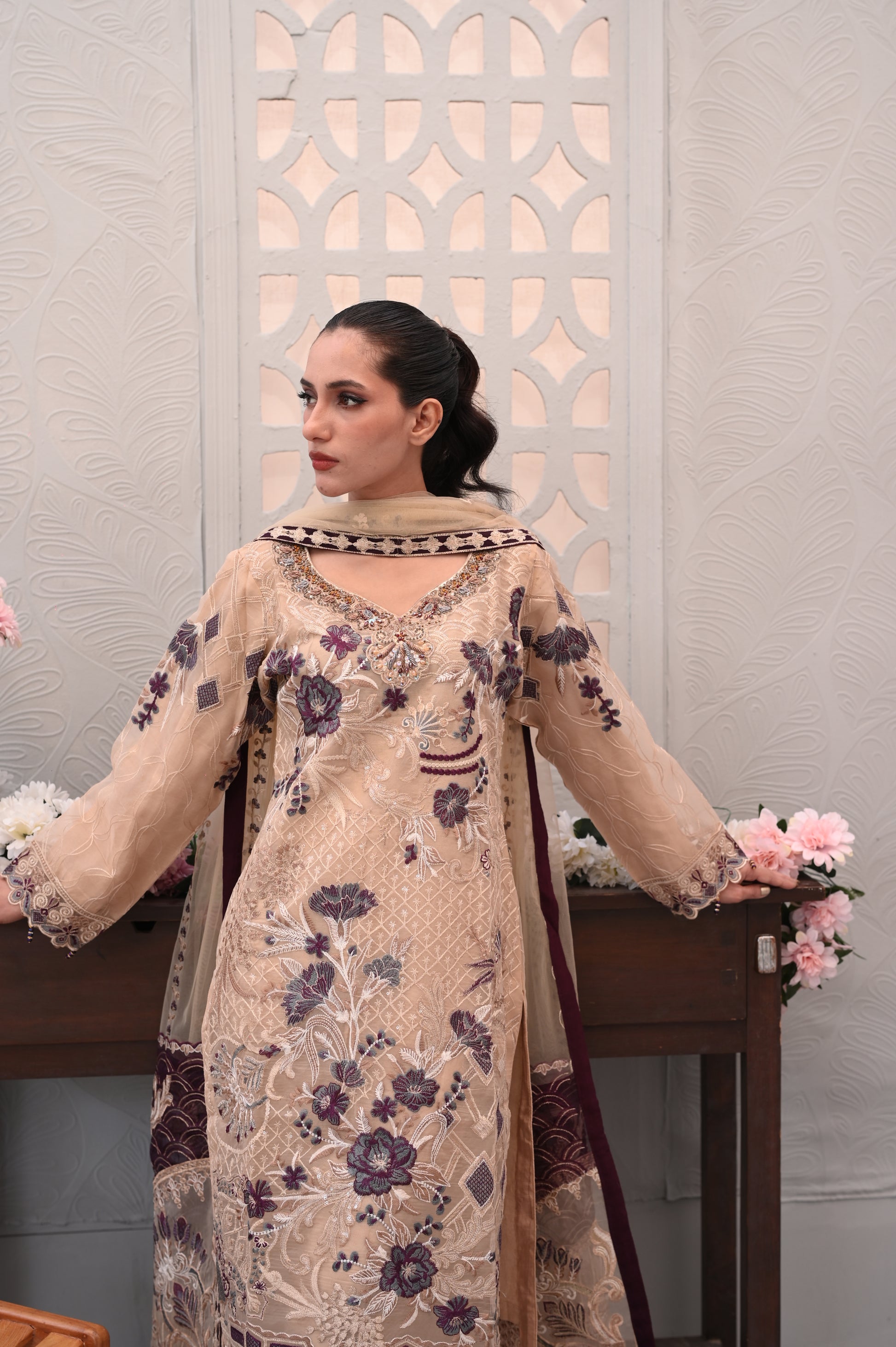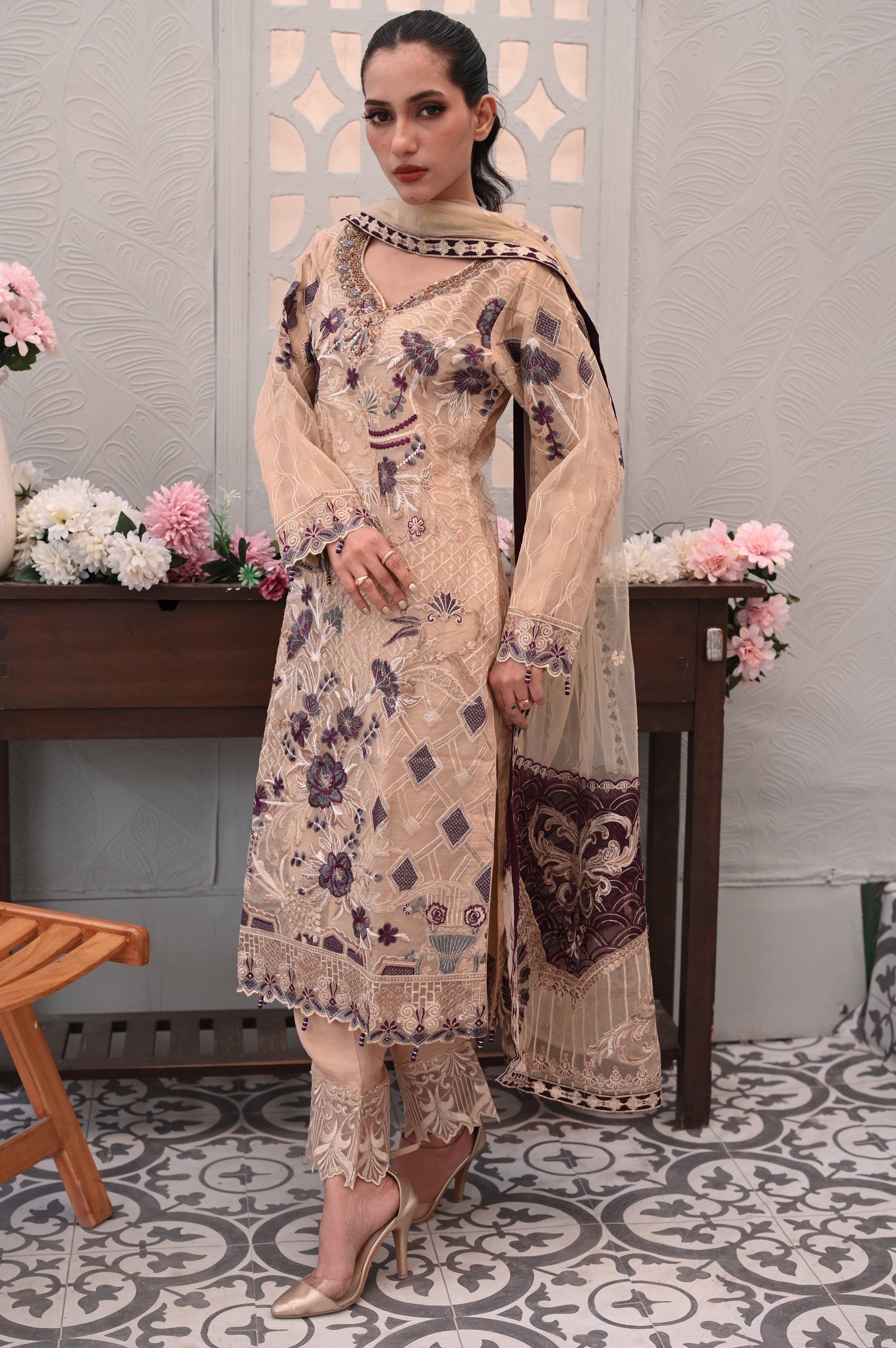 The highlight of this outfit is the heavy machine embroidery, featuring intricate floral and leaf motifs. The embroidery is done in rich shades of purple and white, beautifully contrasting against the soft beige background.